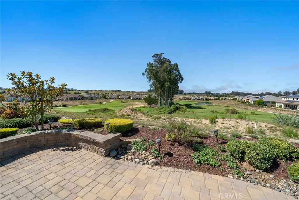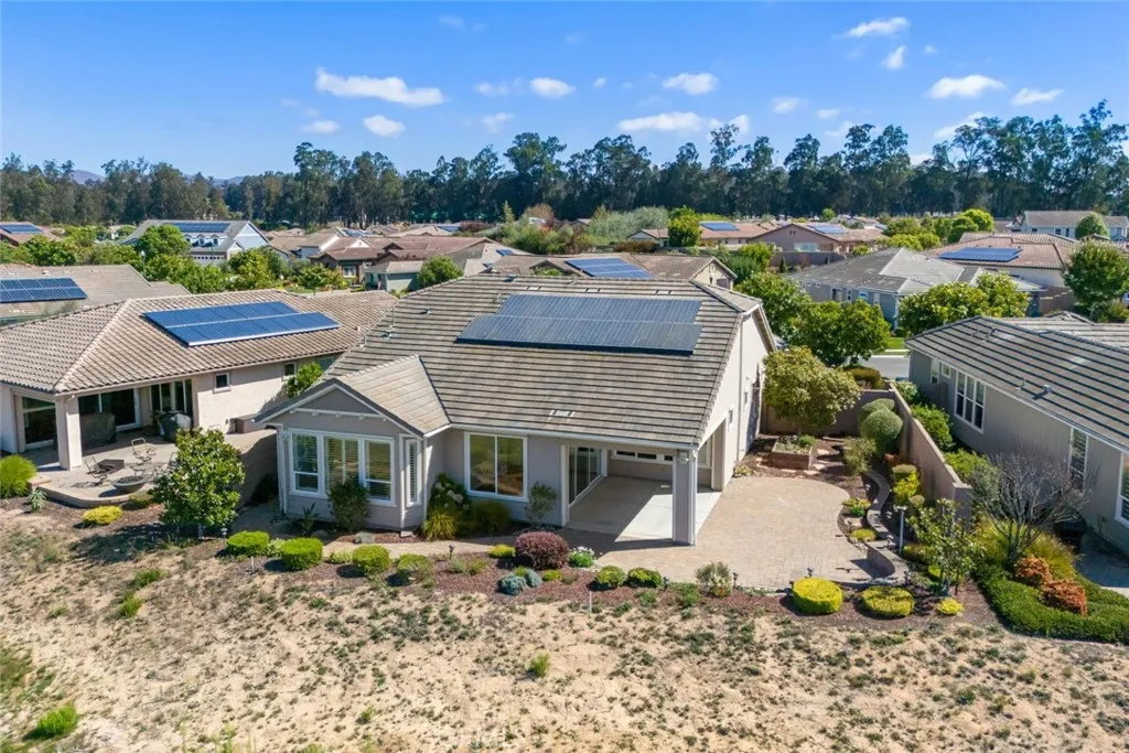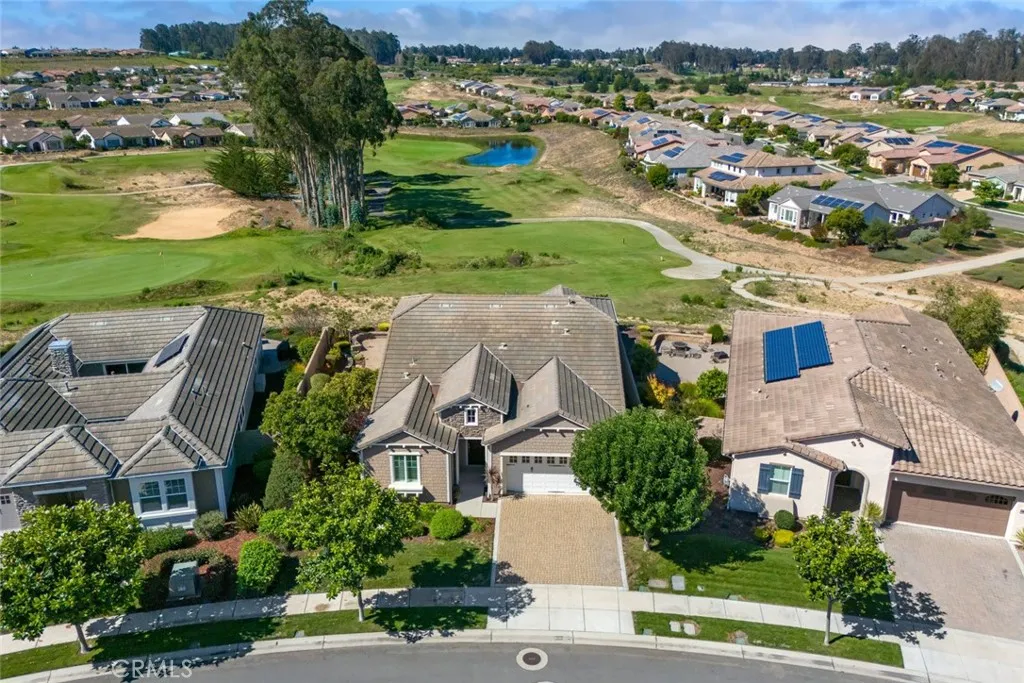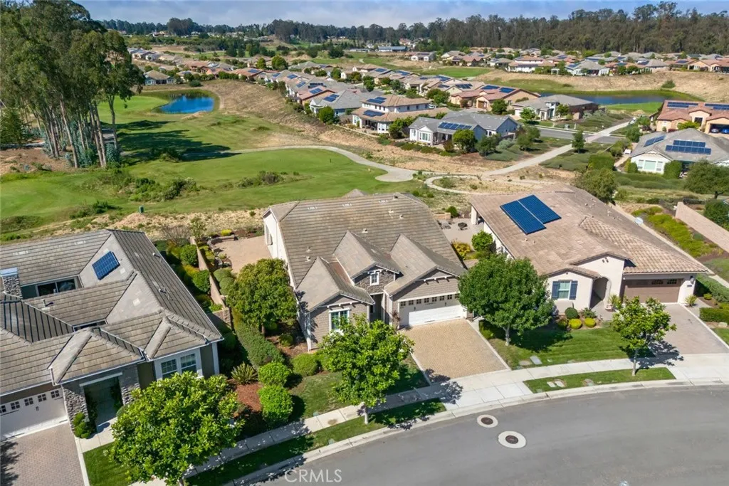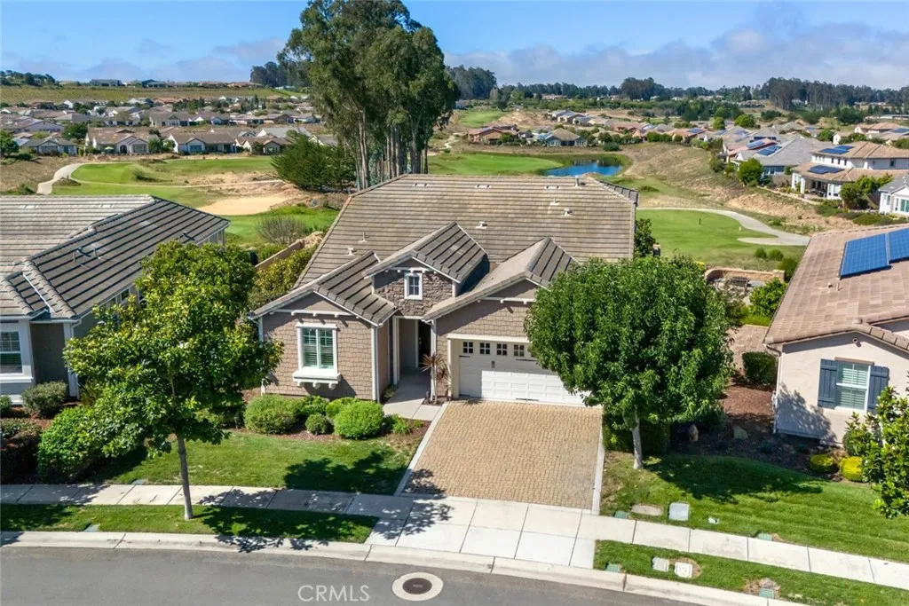 Resort living begins in this California Coastal Nice floor-plan home, beautifully situated on a very desirable cul-de-sac with a birds-eye panoramic view of the 5th, 6th and 7th holes of the Challenge Golf Course, plus the magnificent coastal sunsets. This 1,945 sq. ft. home, built in 2014, offers 2 bedrooms, 2 full bathrooms, plus a den with French door enclosure. Designer upgrades abound, including gorgeous hand scraped engineered wood floors, sweeping granite island with custom lighting, plantation shutters, ceiling fans and a rolling wall of glass providing exquisite views. Enter the gallery hallway and head toward the culinary kitchen - you'll love the raised panel cabinetry, granite countertops and island, tile backsplash, JennAir stainless steel appliances, including a 5-burner cooktop and a walk-in pantry - it's a chefs dream! Around the corner is the coveted SmartSpace/laundry, designed for optimum organization with a built-in desk, storage cabinets and countertops - it's a great space for working from home or enjoying your favorite hobbies. Across from the kitchen is a super comfortable living room with a spacious den next door, and a large dining room with loads of natural light and incredible views. Head outside the rolling wall of glass to the covered patio - it's the perfect spot to relax and enjoy the incredible central coast sunsets. The patio is surrounded by gorgeous, lush landscaping which frames the breathtaking golf course and lake views, and features plenty of hardscape space to entertain family and friends. Meandering pathways lead to the side yards, one outfitted with a raised garden bed. When it's time to head indoors you can retire to your luxurious owner's suite with a spacious bedroom which overlooks the backyard, and an en-suite bathroom with separate dual sinks, tile shower with seamless glass enclosure, and a large walk-in closet. Your guests will enjoy the comfort of their own wing with a light and airy bedroom and a full bath with tub/shower. In addition, there's energy-efficient solar and a 2-car garage. Best of all, this spectacular home is located in Trilogy with all the amenities to fully enjoy life on the Central Coast.