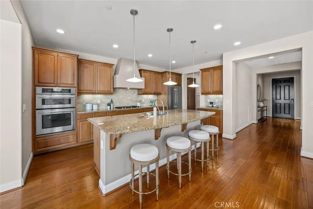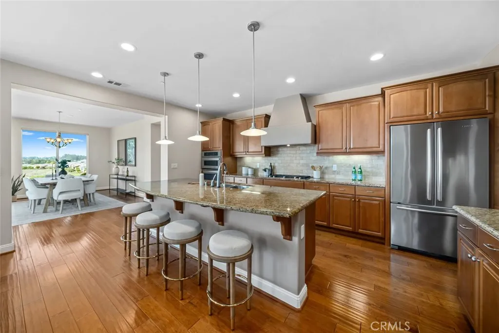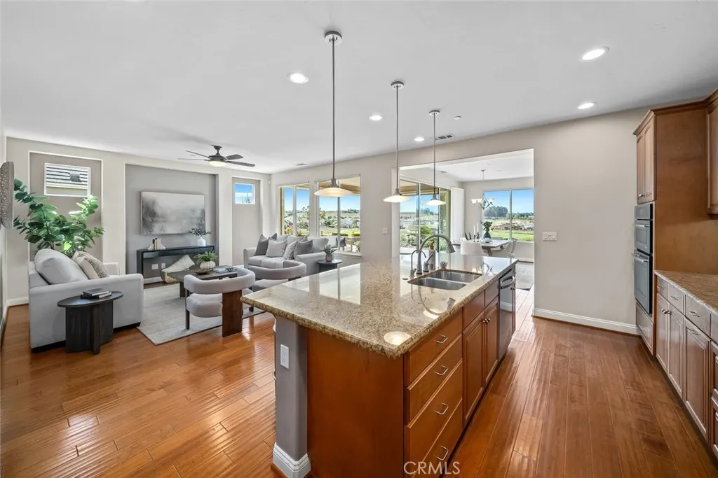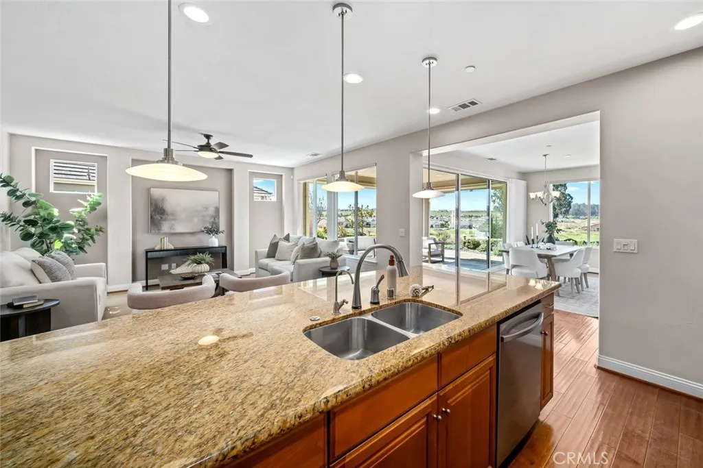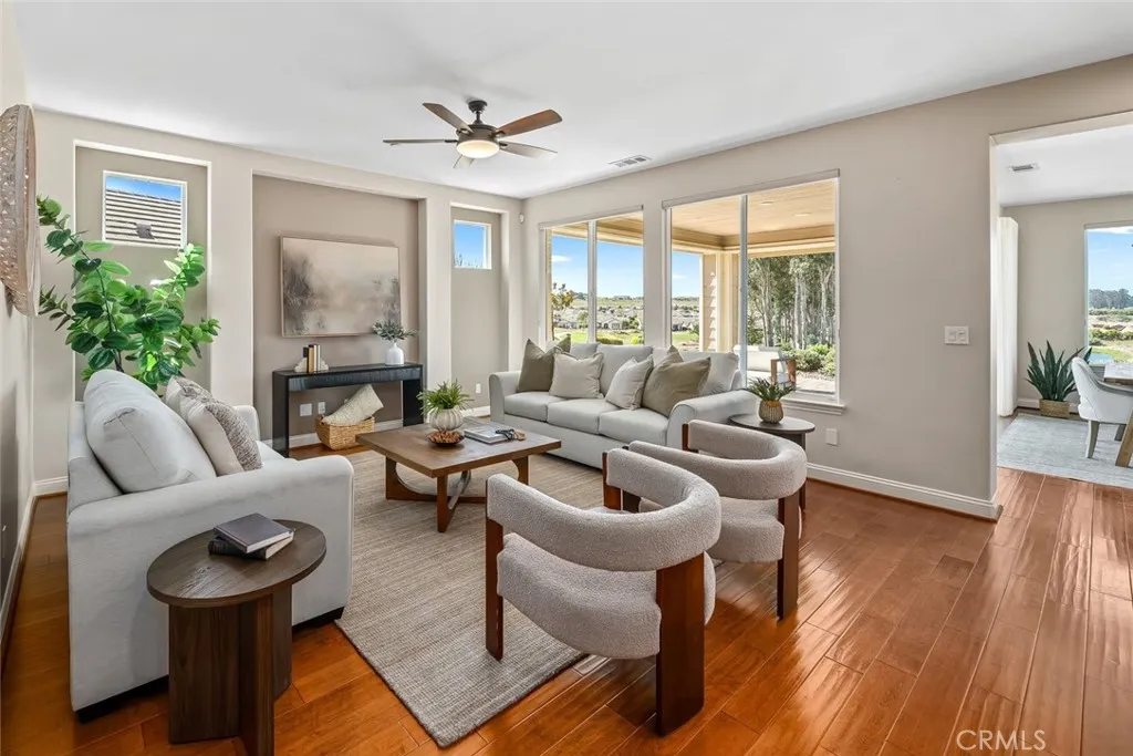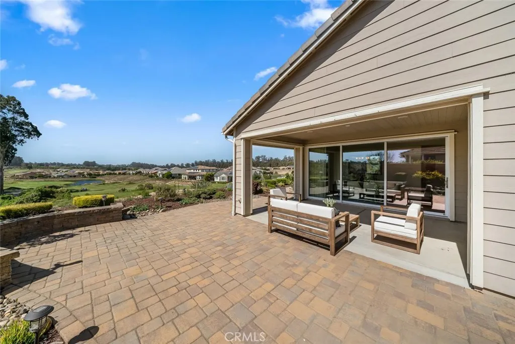 Resort living begins in this California Coastal Nice floor-plan home, beautifully situated on a very desirable cul-de-sac with a birds-eye panoramic view of the 5th, 6th and 7th holes of the Challenge Golf Course, plus the magnificent coastal sunsets. This 1,945 sq. ft. home, built in 2014, offers 2 bedrooms, 2 full bathrooms, plus a den with French door enclosure. Designer upgrades abound, including gorgeous hand scraped engineered wood floors, sweeping granite island with custom lighting, plantation shutters, ceiling fans and a rolling wall of glass providing exquisite views. Enter the gallery hallway and head toward the culinary kitchen - you'll love the raised panel cabinetry, granite countertops and island, tile backsplash, JennAir stainless steel appliances, including a 5-burner cooktop and a walk-in pantry - it's a chefs dream! Around the corner is the coveted SmartSpace/laundry, designed for optimum organization with a built-in desk, storage cabinets and countertops - it's a great space for working from home or enjoying your favorite hobbies. Across from the kitchen is a super comfortable living room with a spacious den next door, and a large dining room with loads of natural light and incredible views. Head outside the rolling wall of glass to the covered patio - it's the perfect spot to relax and enjoy the incredible central coast sunsets. The patio is surrounded by gorgeous, lush landscaping which frames the breathtaking golf course and lake views, and features plenty of hardscape space to entertain family and friends. Meandering pathways lead to the side yards, one outfitted with a raised garden bed. When it's time to head indoors you can retire to your luxurious owner's suite with a spacious bedroom which overlooks the backyard, and an en-suite bathroom with separate dual sinks, tile shower with seamless glass enclosure, and a large walk-in closet. Your guests will enjoy the comfort of their own wing with a light and airy bedroom and a full bath with tub/shower. In addition, there's energy-efficient solar and a 2-car garage. Best of all, this spectacular home is located in Trilogy with all the amenities to fully enjoy life on the Central Coast.