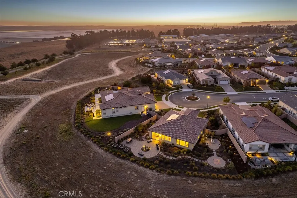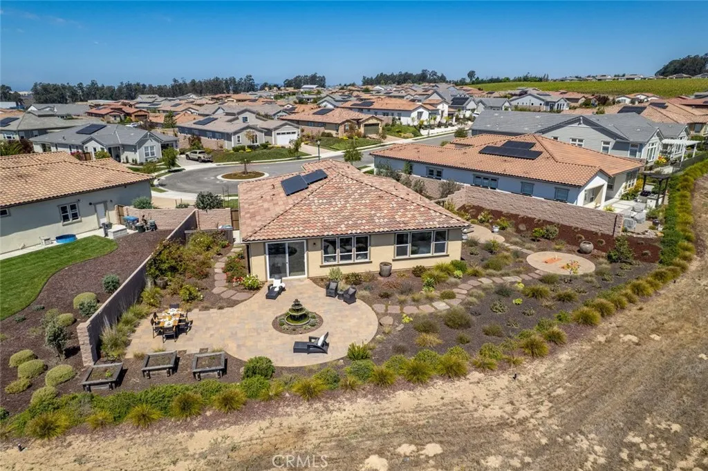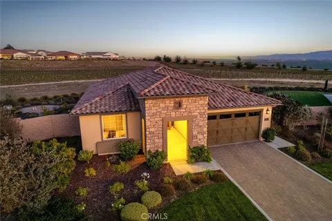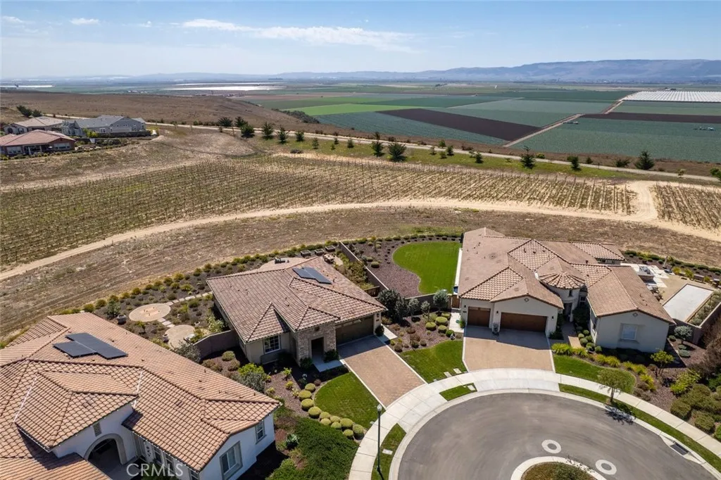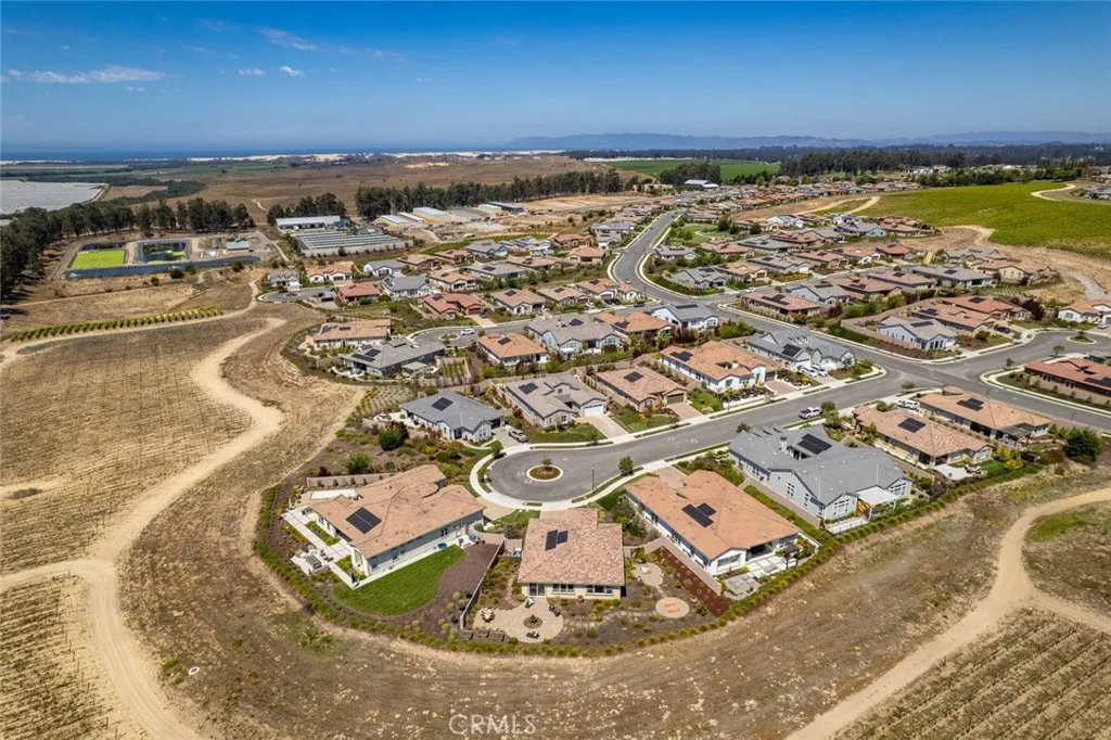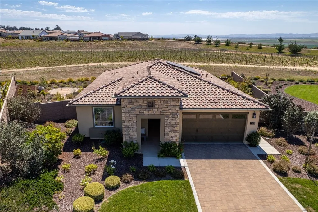 Step into unparalleled elegance with this single-level Solvang model, perched on a premium almost 11,000sf vineyard and mountain view lot in Trilogy at Monarch Dunes. Nestled at the end of a quiet cul-de-sac, this 2-bedroom plus office, 2-bathroom SOLAR and SMART home exudes the effortless sophistication of a model home, with tile floors, neutral palettes, & abundant natural light. The award-winning floor plan centers around a spacious great room with soaring ceilings, seamlessly connecting to a stunning kitchen featuring a custom waterfall-edge island, quartz countertops, top-tier GE Profile appliances, reverse osmosis system plumbed into fridge & spigot, five-burner gas stove, and stained maple soft-close cabinetry with pull-out drawers. A large pantry & oversized laundry room with desk and ample storage add both function and style. The primary suite is a serene retreat, offering breathtaking vineyard and mountain views, high ceilings, a spa-like bath with dual sinks, quartz countertops, walk-in shower with bench and decorative tile, & an expansive walk-in closet. The guest wing includes a corner bedroom with two large windows, a bath with soaking tub/shower combo, and an office , perfect for work, study or even a 3rd bedroom! Designed for modern living, this smart home features sophisticated automation: lighting with dimmers, thermostat, solar, water heater, appliances, remote entry, and voice activation via Alexa and Siri, along with Ring, MyQ, Rachio irrigation, internet booster for outdoor WIFI coverage, smart HQ, and programmable outdoor lighting/fountain. Step outside to your private resort: four distinct patios for alfresco dining, sun lounging, yoga, or morning reading, surrounded by lush, low-maintenance landscaping with beautiful fountain setting a peaceful tone with rose and veggie gardens, five fruit trees, and panoramic vineyard and mountain vistas. Stone accents, paver driveway, and southern exposure complete the idyllic setting. Live the Trilogy lifestyle with championship golf, fine dining, luxury spa, state-of-the-art fitness, and endless social opportunities. Relax in the expansive backyard and enjoy sweeping views of wildflower meadows and even NASA and SpaceX launches from Vandenberg. Golf course community with all the amenities right at your fingertips & just five miles from Oso Flaco Lake State Park dunes and beaches. Exceptional design, luxury, and technology converge to create a home that's more than a residence - it's a lifestyle.